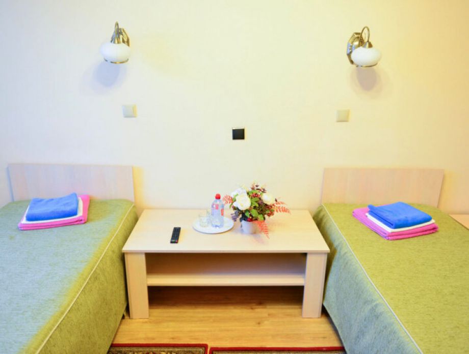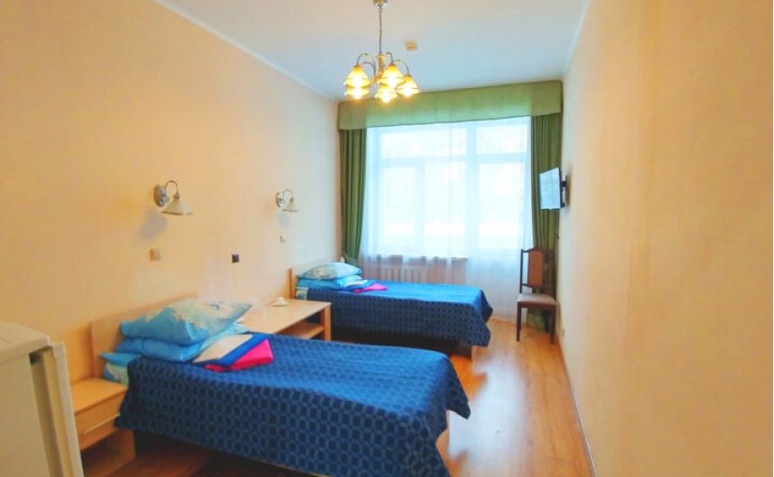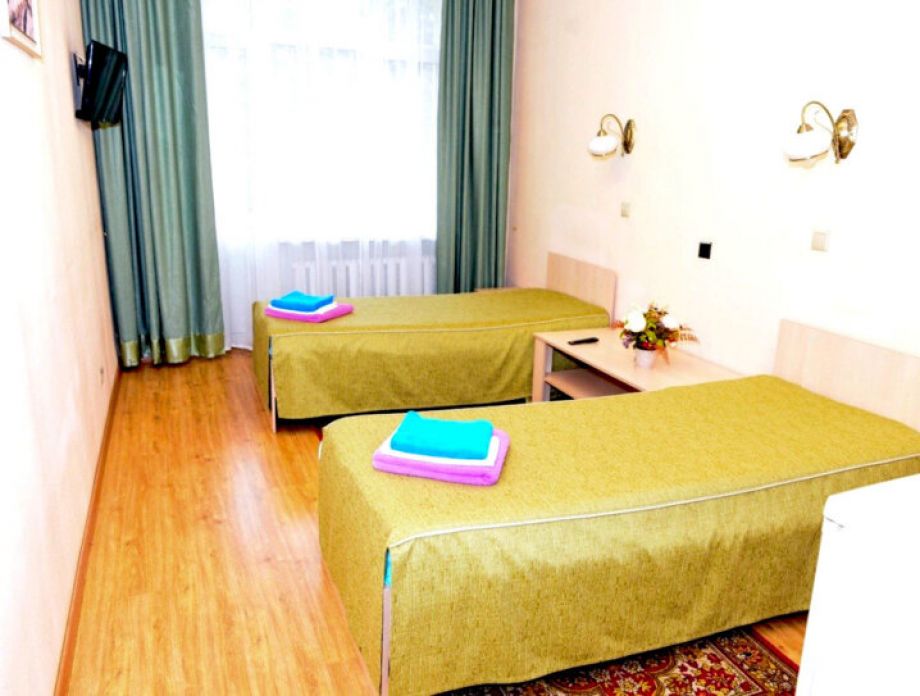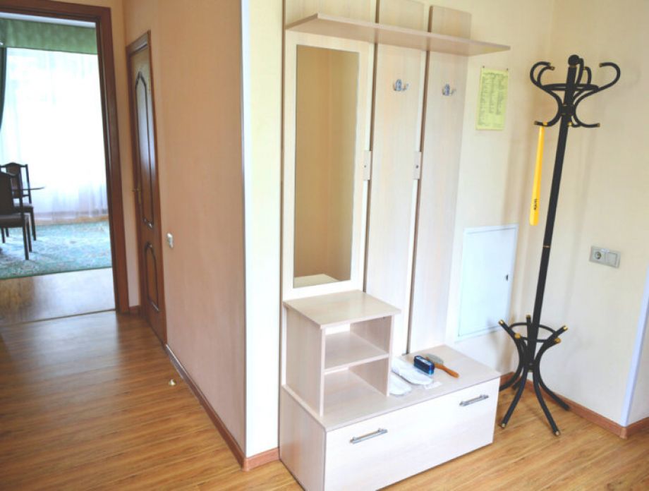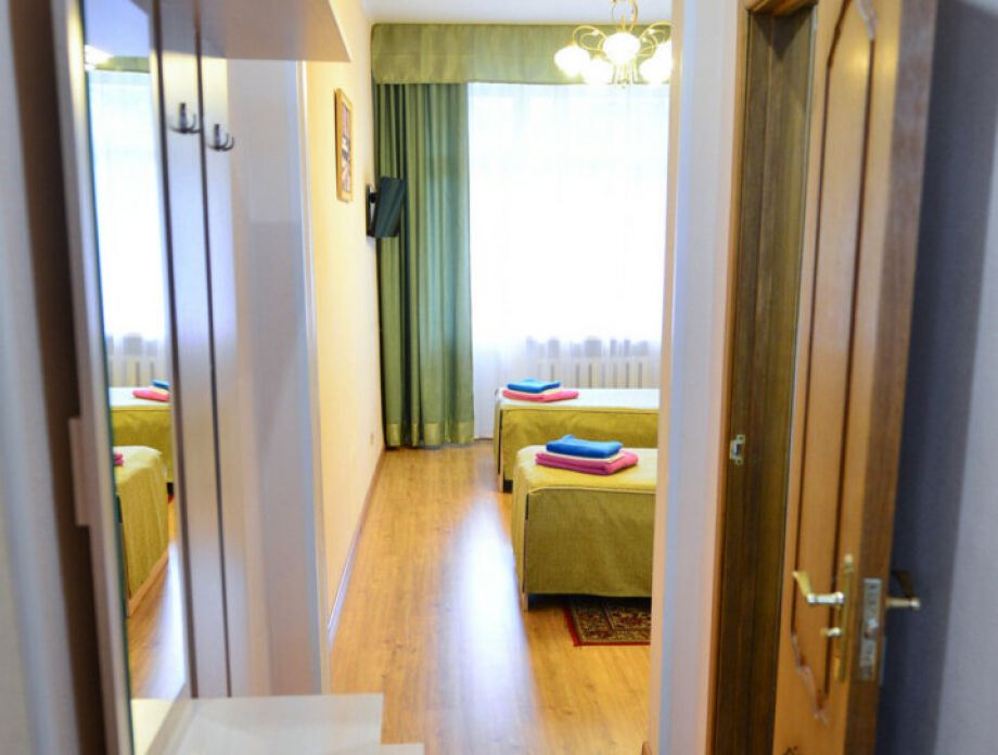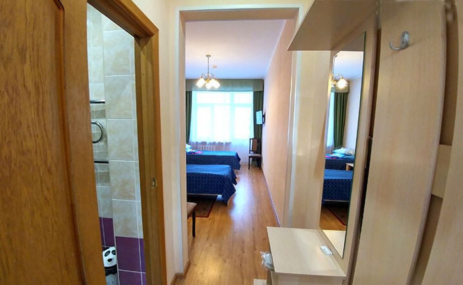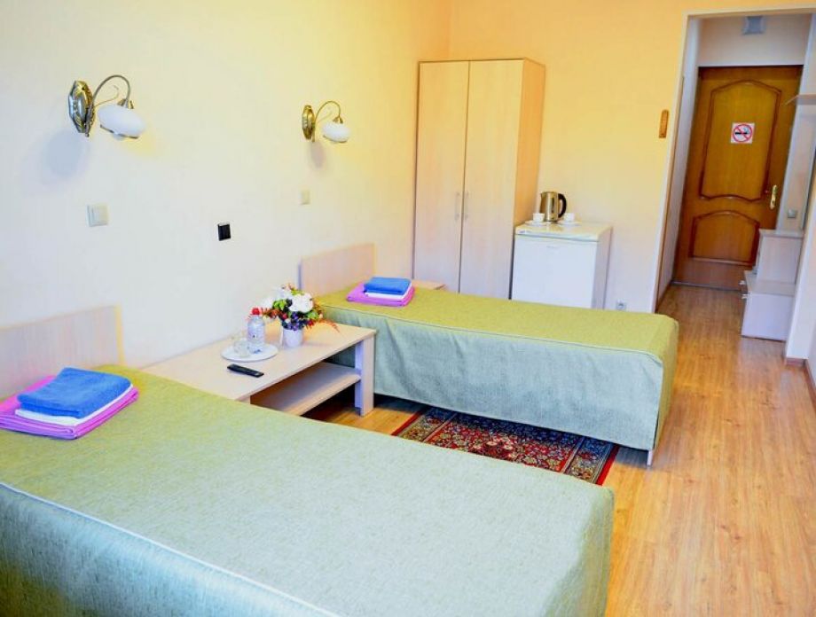 В номере: шкаф, холодильник, две тумбочки, телевизор, плотные шторы, мини прихожая с зеркалом.