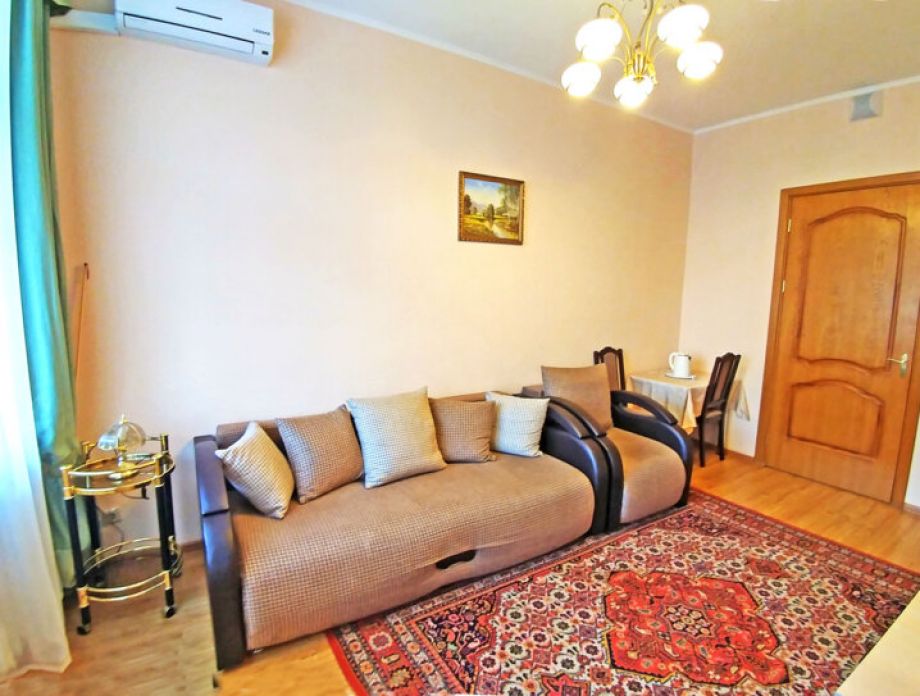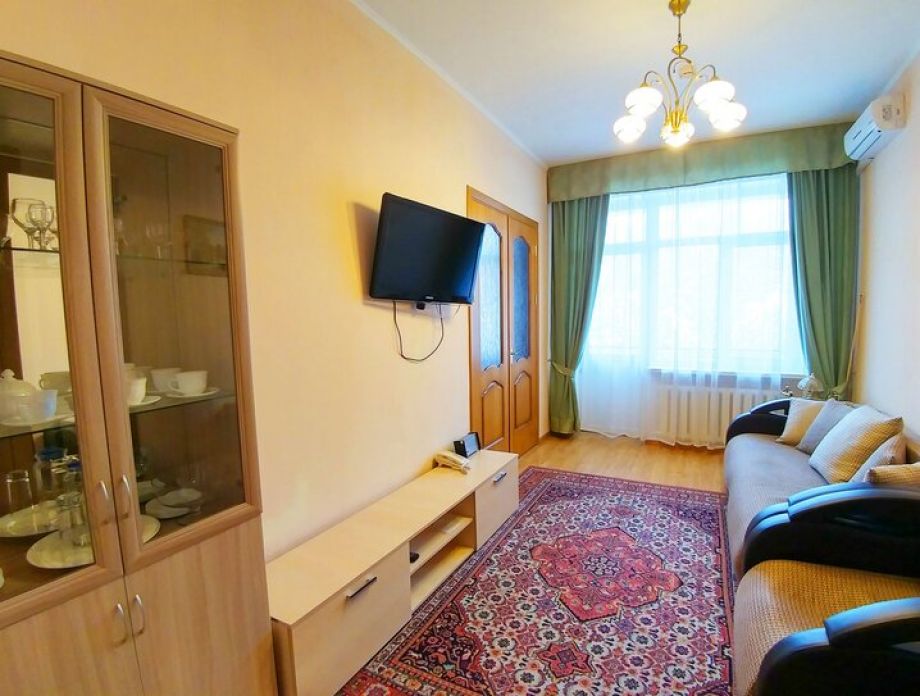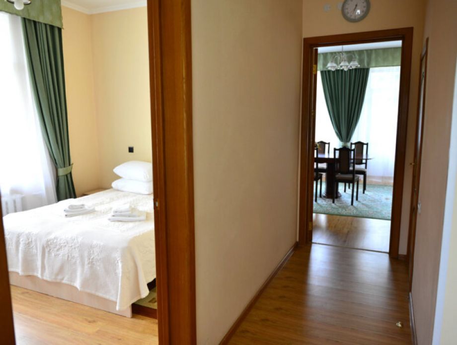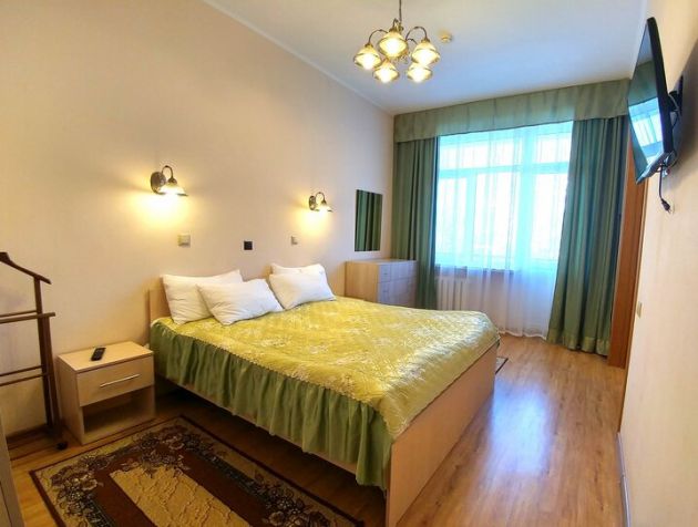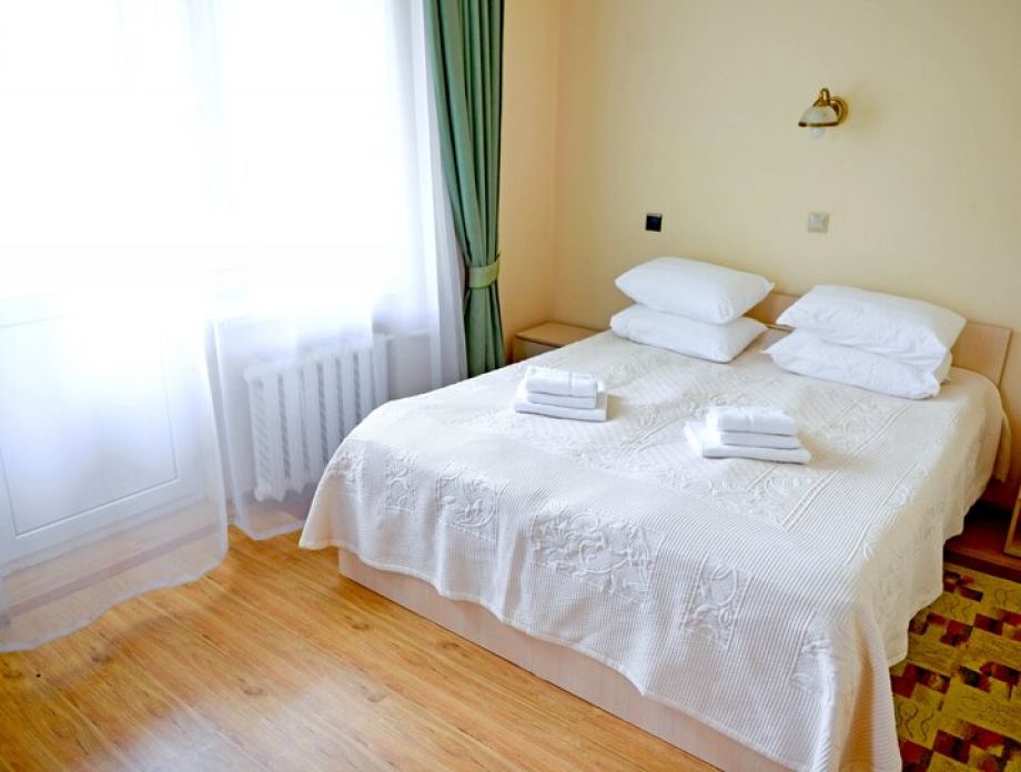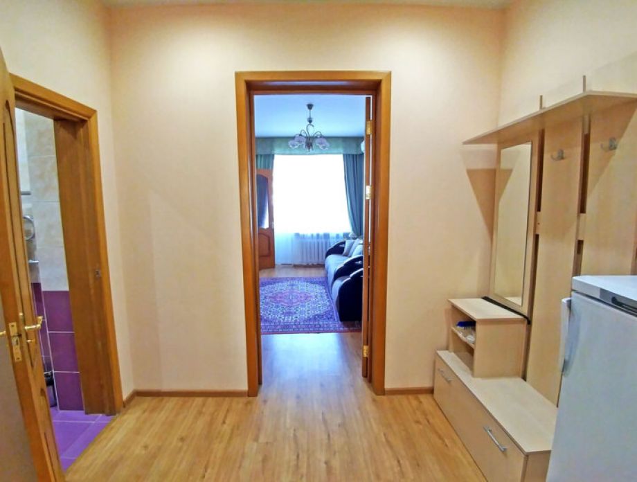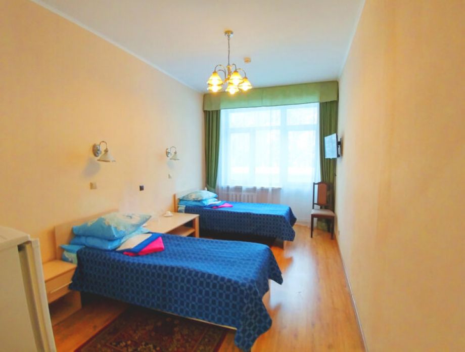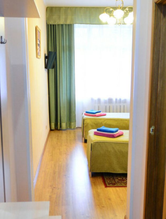 В номере: шкаф, холодильник, две тумбочки, телевизор, плотные шторы, мини прихожая с зеркалом.