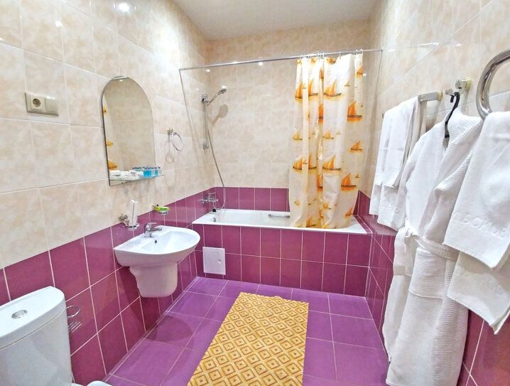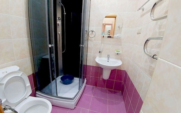 Санузел: душевая кабина, умывальник, унитаз, зеркало, комплект полотенец, туалетная бумага, мыло.
