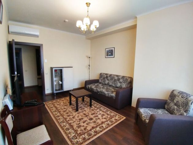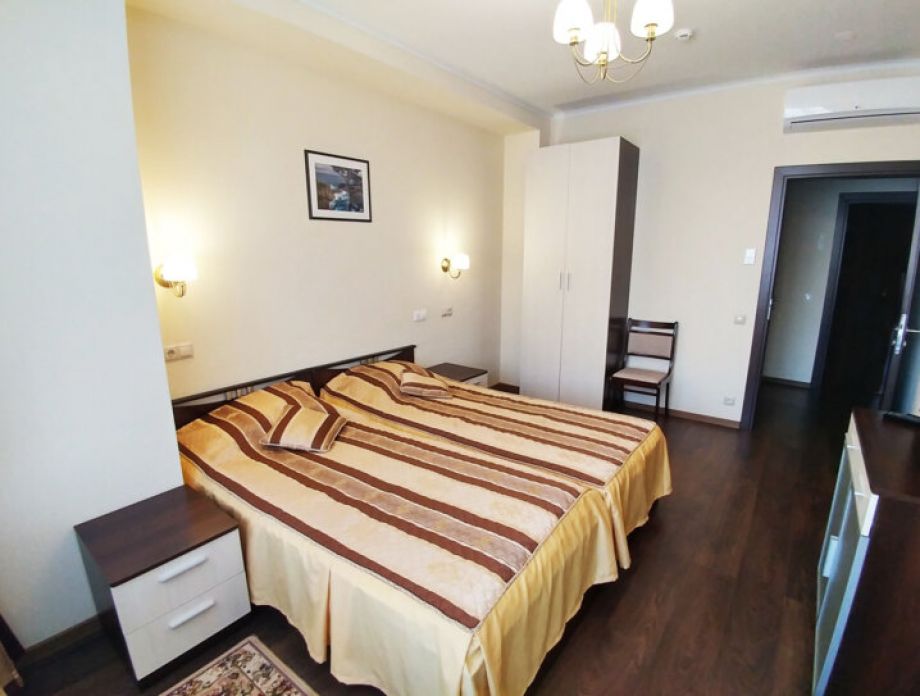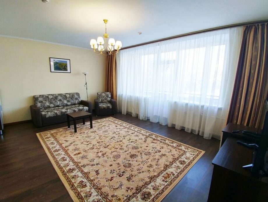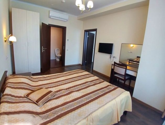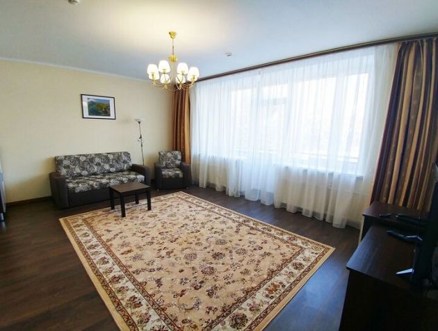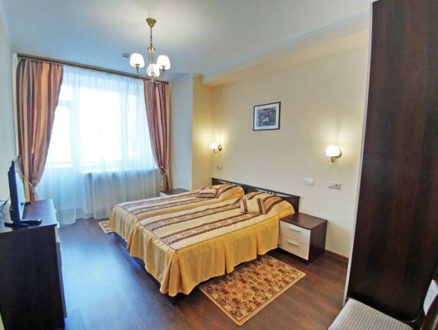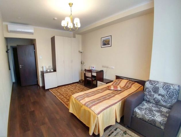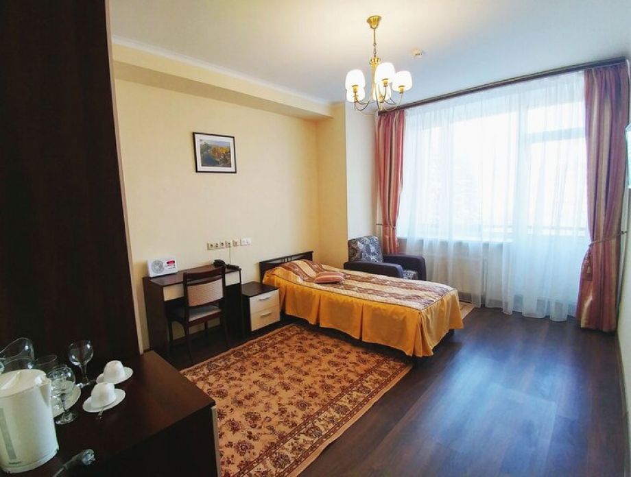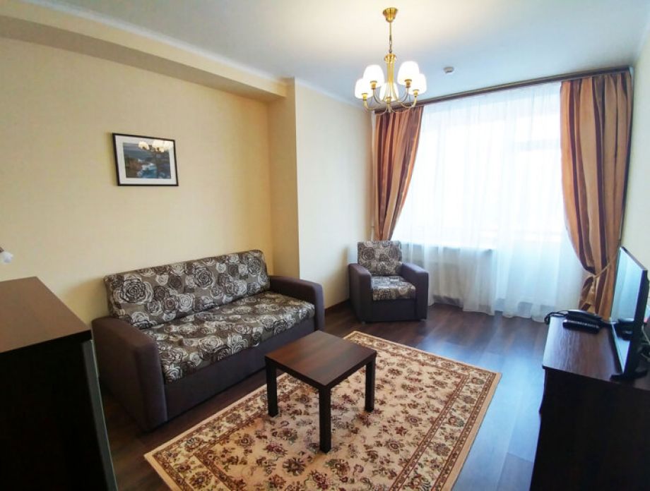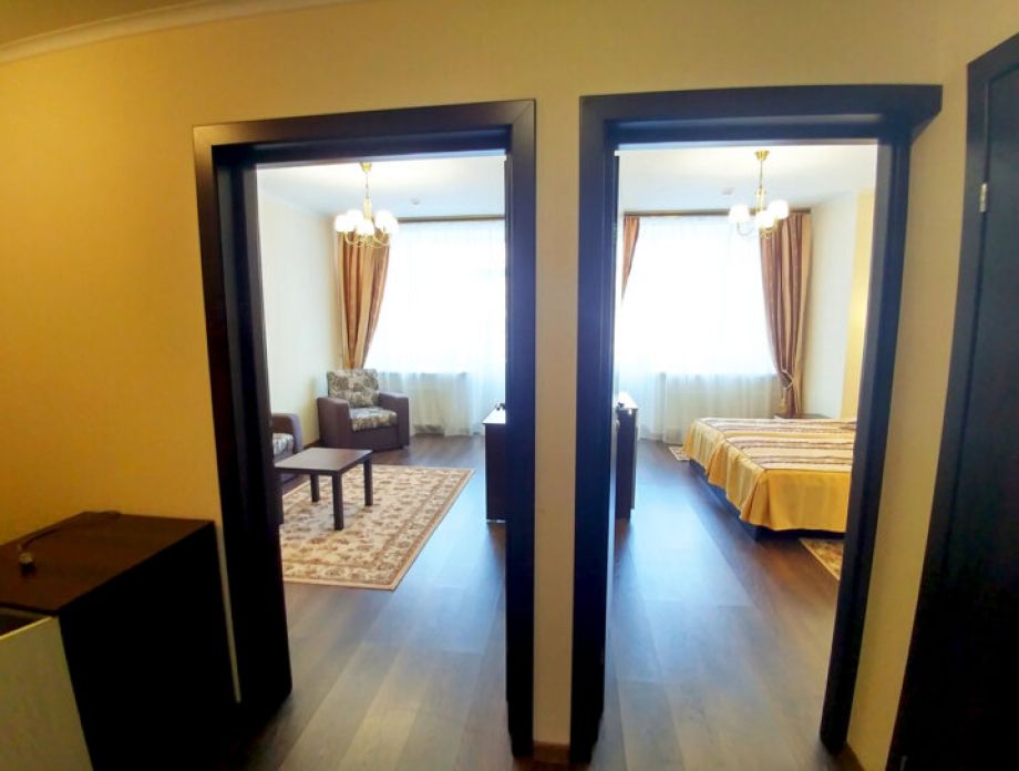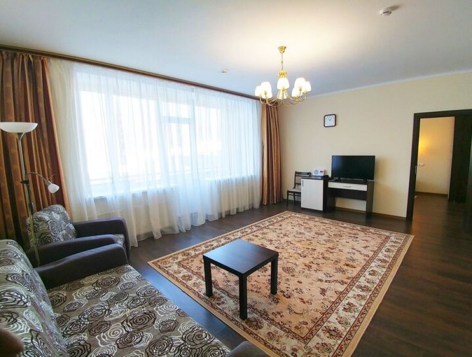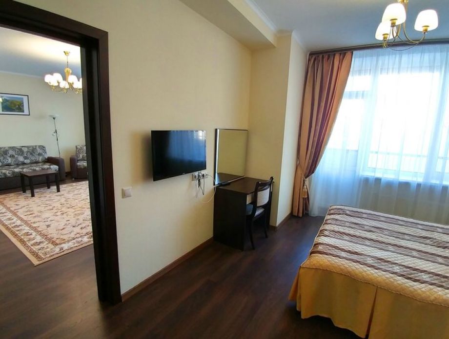 В номере: шкаф, холодильник, 2 тумбочки, журнальный стол, мягкая мебель, витрина с посудой, плотные шторы, кондиционер, сейф, прихожая, телевизоры.