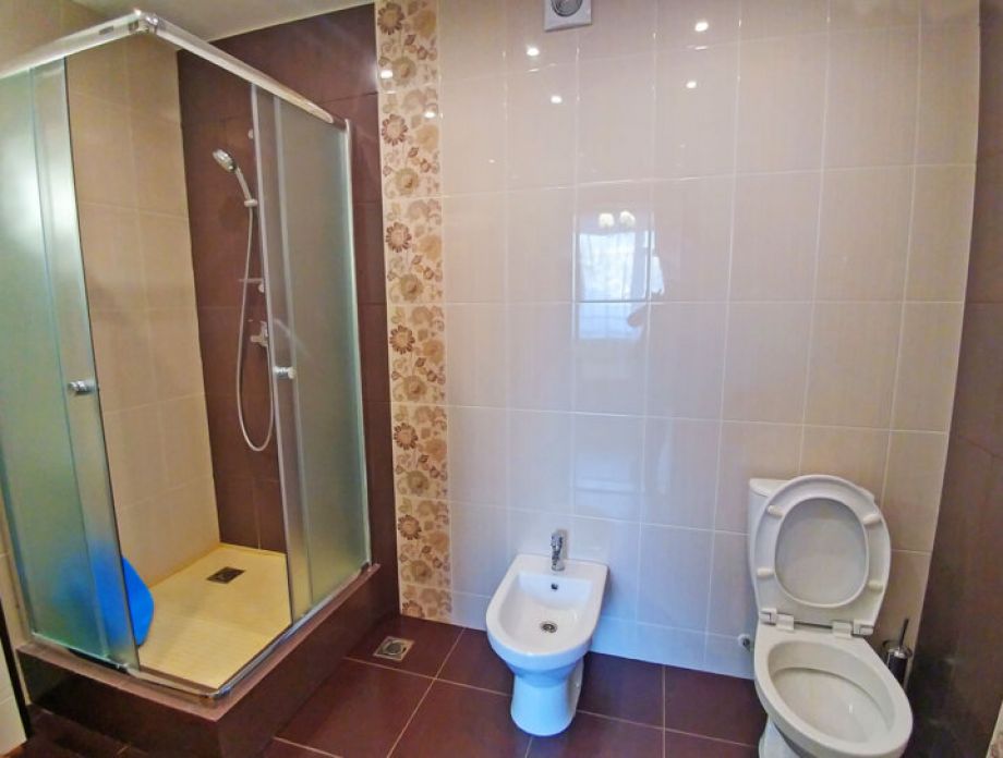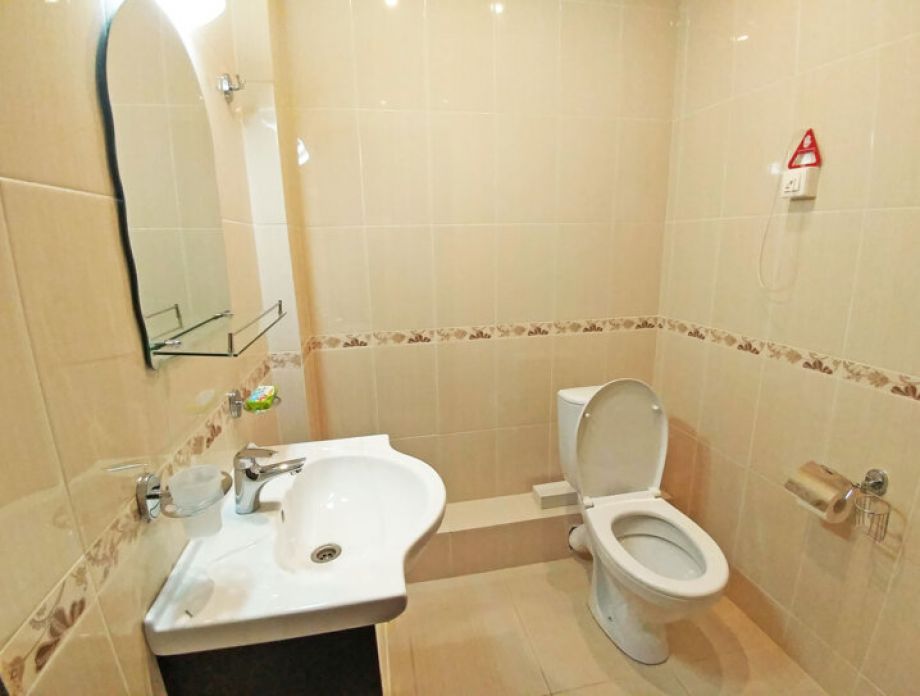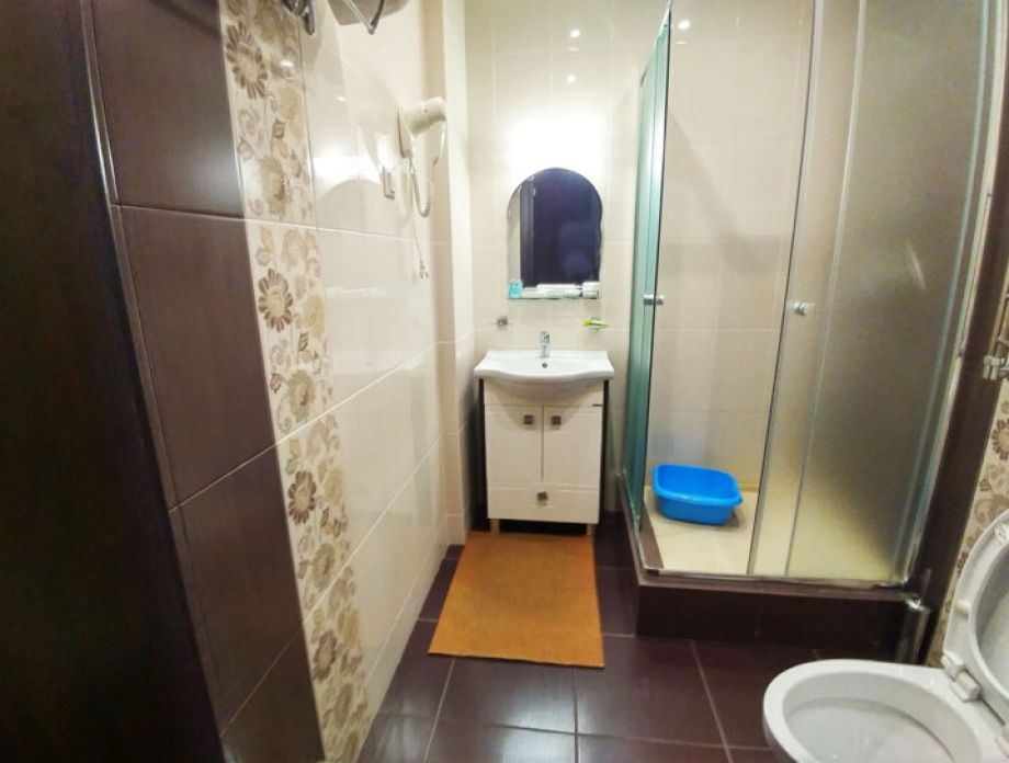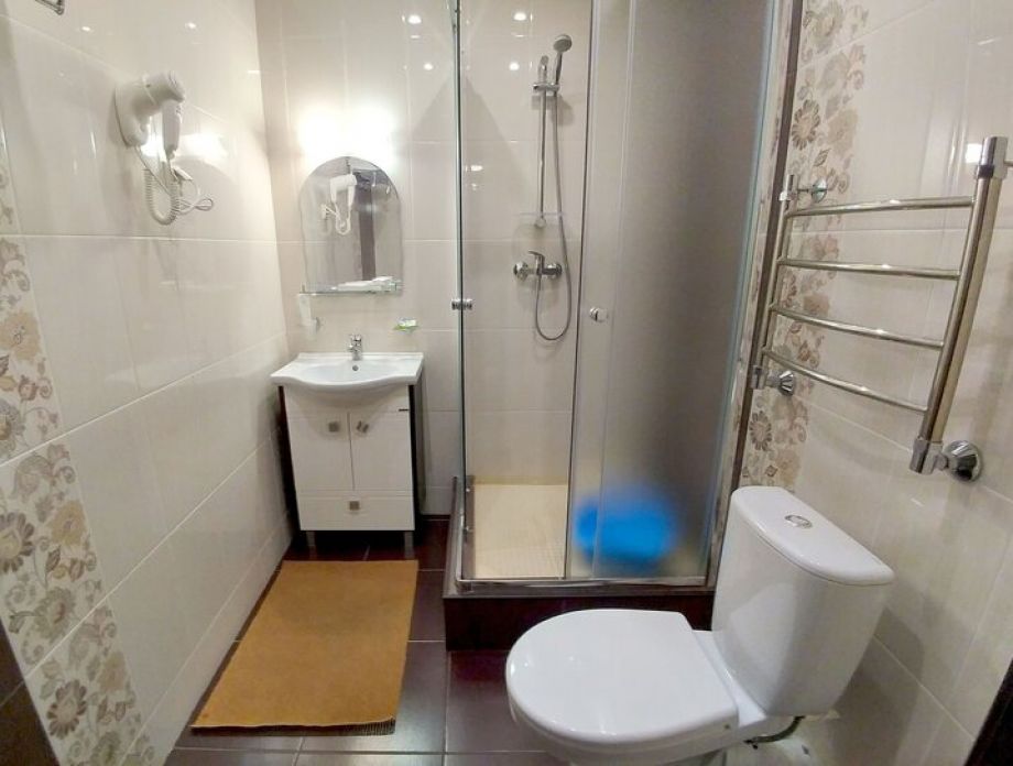 Санузел: гостевой туалет, душевая кабина, умывальник, унитаз, фен, зеркало, комплект полотенец, туалетная бумага, мыло.